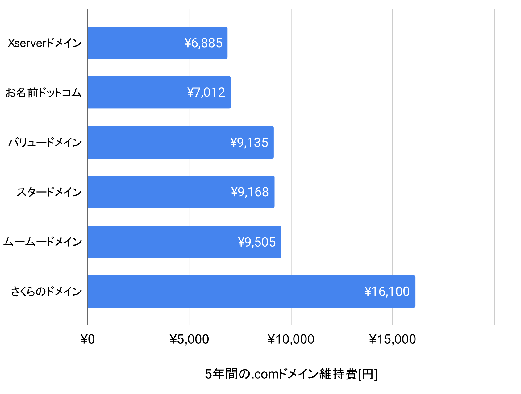 これを見ると分かるように、.comドメインの5年維持費はXserverドメインが最安となりました。